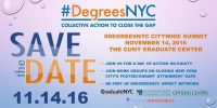On November 14, 2016 at the CUNY Graduate Center, #DegreesNYC is hosting a Citywide Summit. The summit will be a full day of action around closing post-secondary equity gaps in New York City with all stakeholders - including city agencies, colleges and universities, community-based organizations and non-profits, faith-based organizations, funders and philanthropic organizations, businesses and corporations, community members, parents, families, and young people themselves. Participants will have an opportunity to join work groups and be part of #DegreesNYC's Impact Network. Registration is required.